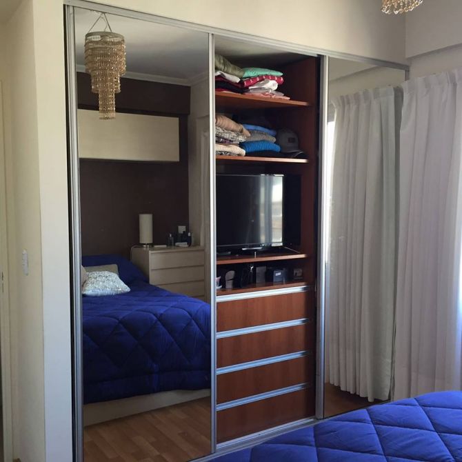Dormitorio de 3 x 3 con pisos flotantes y placard empotrado con frente espejado