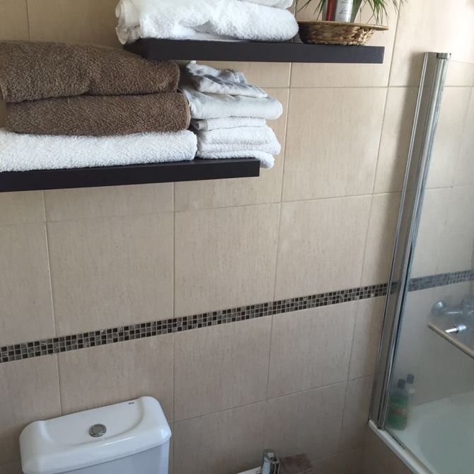 Baño completo con bañera, mampara de diseño y revestimientos de porcelanato hasta el techo.