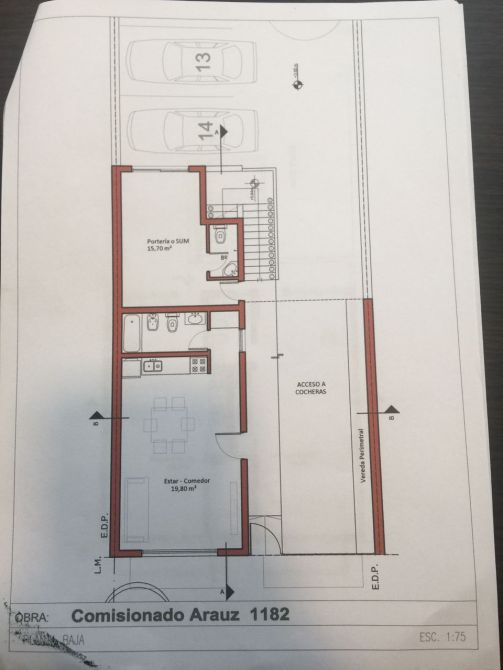 Cocina de 10 m2 Aprox. integrada el Estar Comedor de 17 m2. Ventana al frente. Escalera de acceso a la 2° Planta.