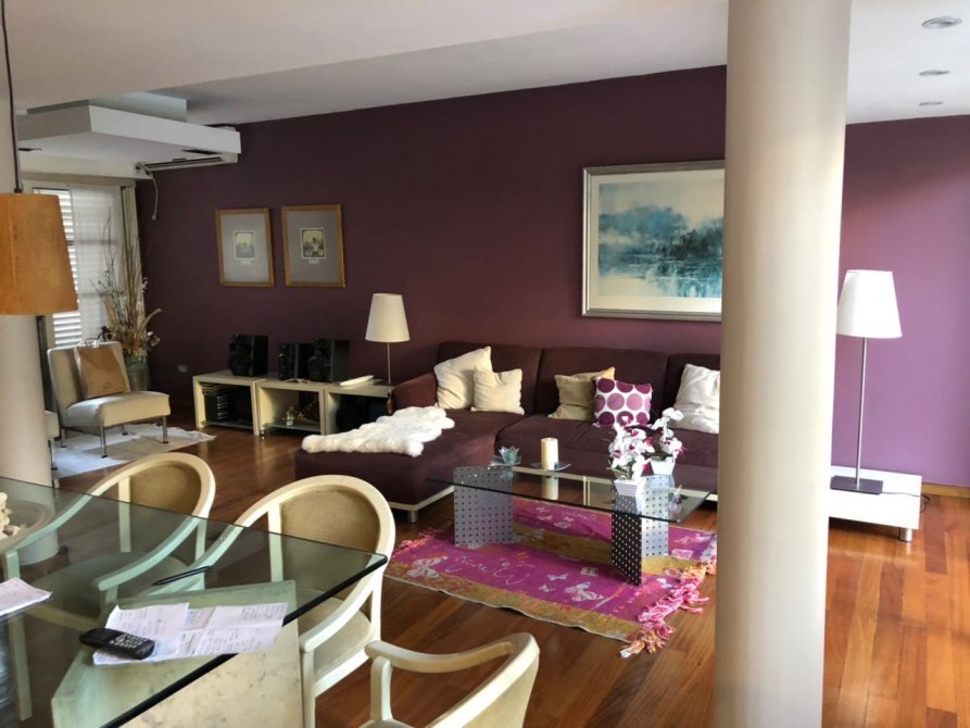 Acceso por amplio Living comedor, de 6,20 x 7 Mts. con piso de madera maciza, impecable. Ventanales con vista al jardín. Detalles de iluminación y desniveles en el techo.