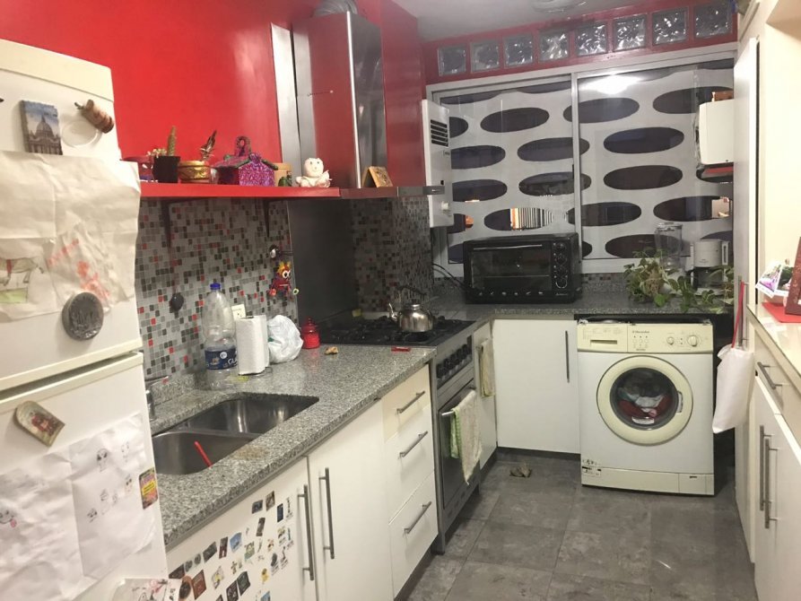 Cocina semi integrada: 4,05 x 3 Mts. Piso de porcelanato pulido en color gris. Muebles de alacena y bajo mesada en melamina. Mueble hecho a medida con barra. Mesada de granito, cocina industrial, campana de acero. Venecitas a tono con los muebles.