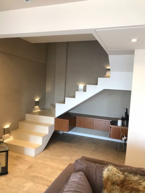 Escalera de material, con terminación de cemento alisado y artefactos de luz difusores.