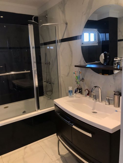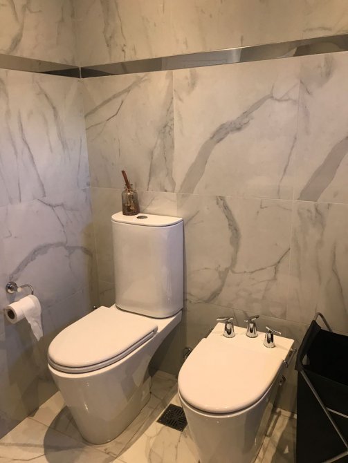 Baño en suite: 2,30 x 2,50 Mts. Piso y paredes con revestimiento en pocelanatto carrara y negro. Hidromasaje con mampara fija + 1 paño rebatible.