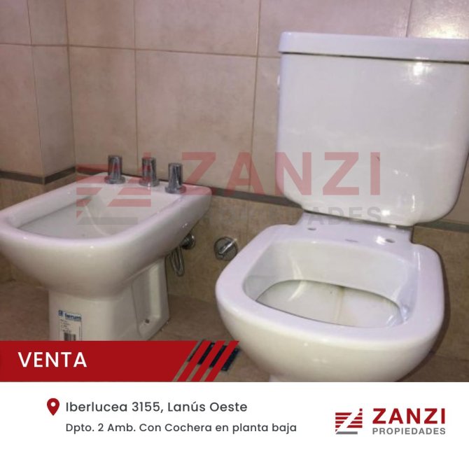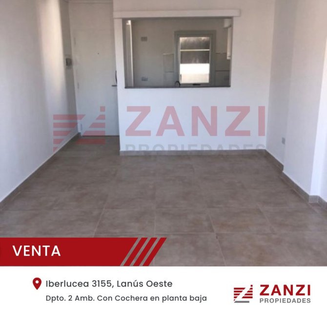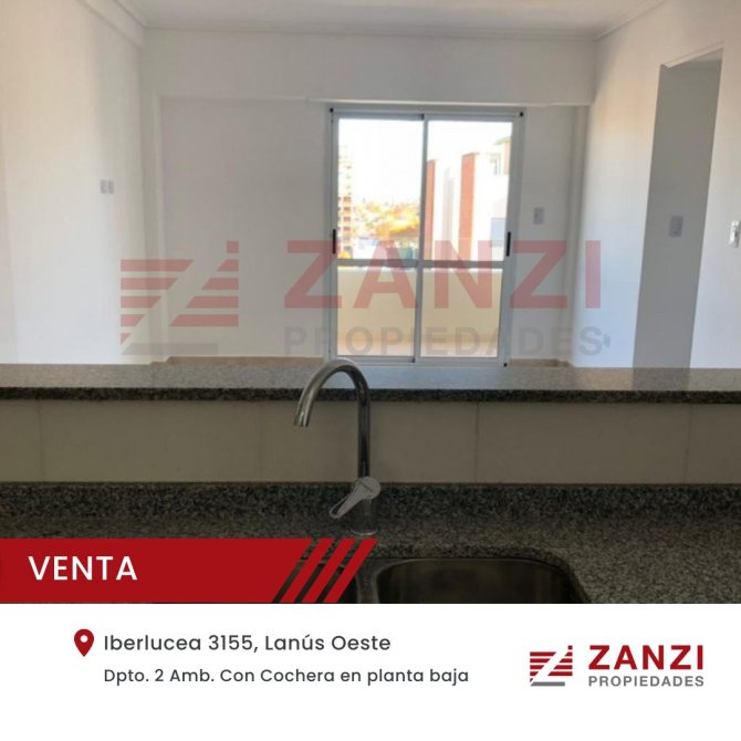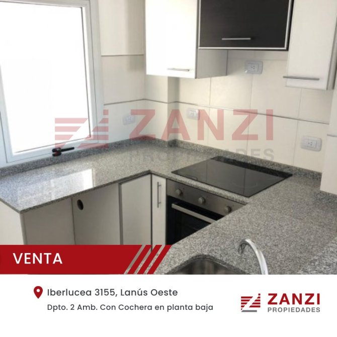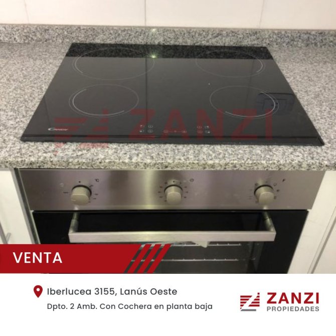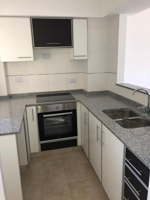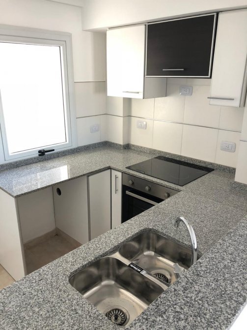 Cocina de 2 x 2 Mts. Semi integrada al estar comedor, mesada de granito, horno electrico y anafe vitroceramico. Muebles de alacena y bajo mesada en melamina. Instalacion para lavarropas en el bajomesada.