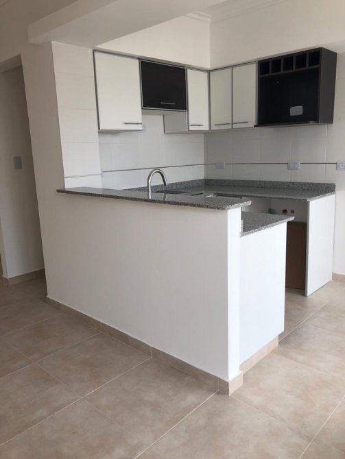 Cocina con comedor diario: 2,20 x 3,80 Mts. Semi integrada al estar comedor. Mesada de granito, horno eléctrico, anafe vitrocerámico. Muebles de alacena y bajo mesada en melamina. Instalación para lavarropas.