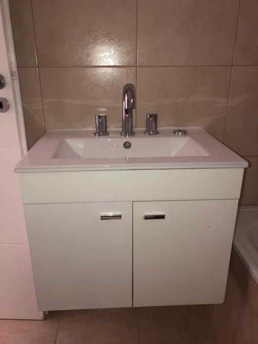 Baño: 2,10 x 1,50 Mts. Revestimiento cerámico completo. Sanitarios completos. Bañera. Vanitory laqueado, flotante.