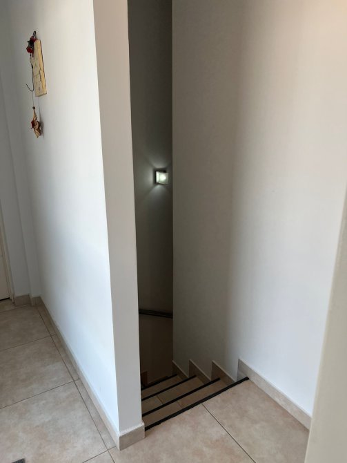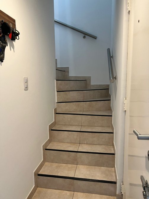 Escalera con revestimiento cerámico y barandas de acero.