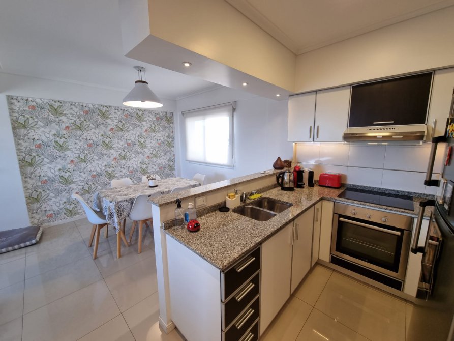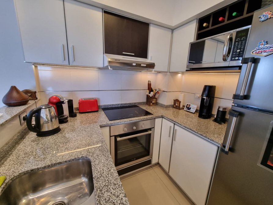 Mesada de granito. Bacha doble con canilla monocomando. Horno y anafe vitrocerámico eléctricos.