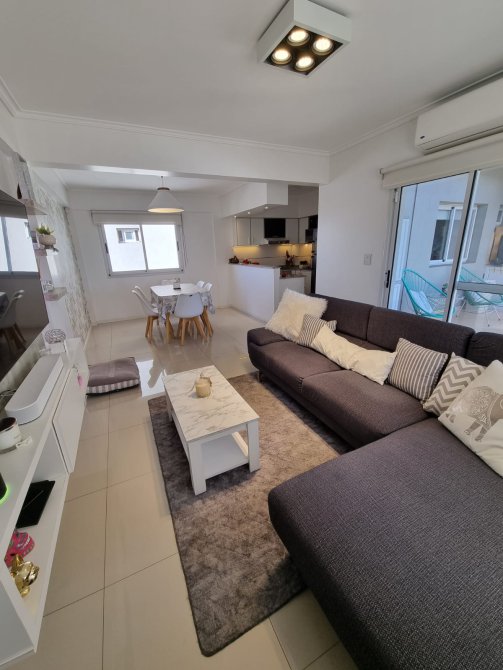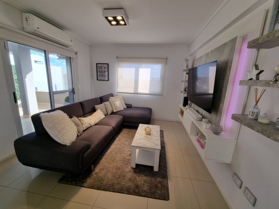 Amplia sala de estar con pisos de porcelanato. Aire acondicionado. Doble circulación de aire y luz natural. Ventana y Ventana balcón con salida a exclusivo balcon terraza.