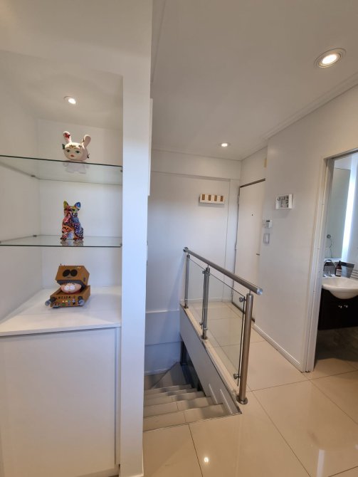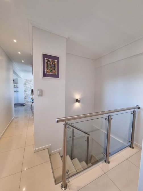 Escalera de porcelanato con baranda en vidrio con postes en acero inoxidable.