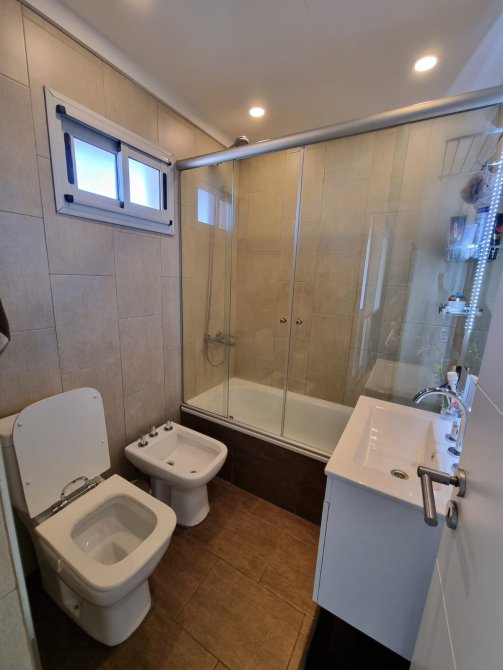 Baño con revestimiento cerámico en su totalidad, bañera con mampara de vidrio. vanitory y sanitarios completos. ventana (aire y luz natural)