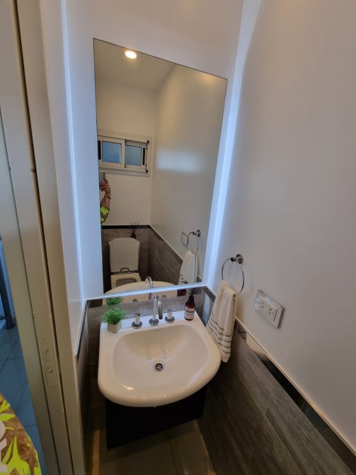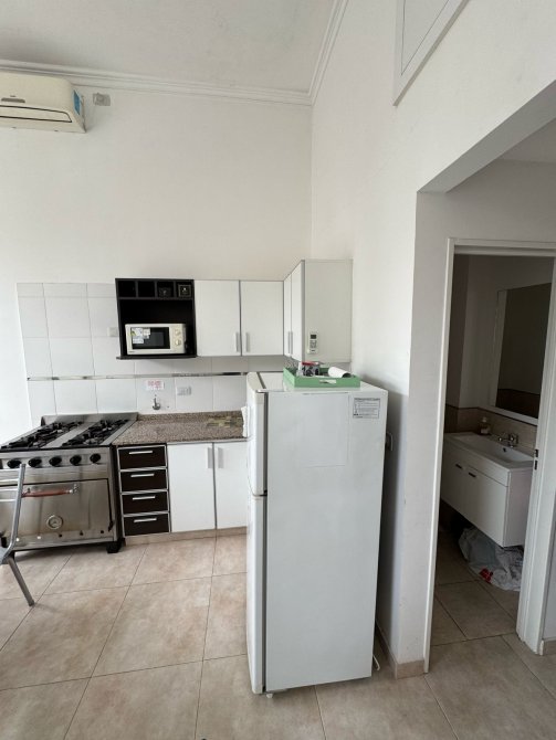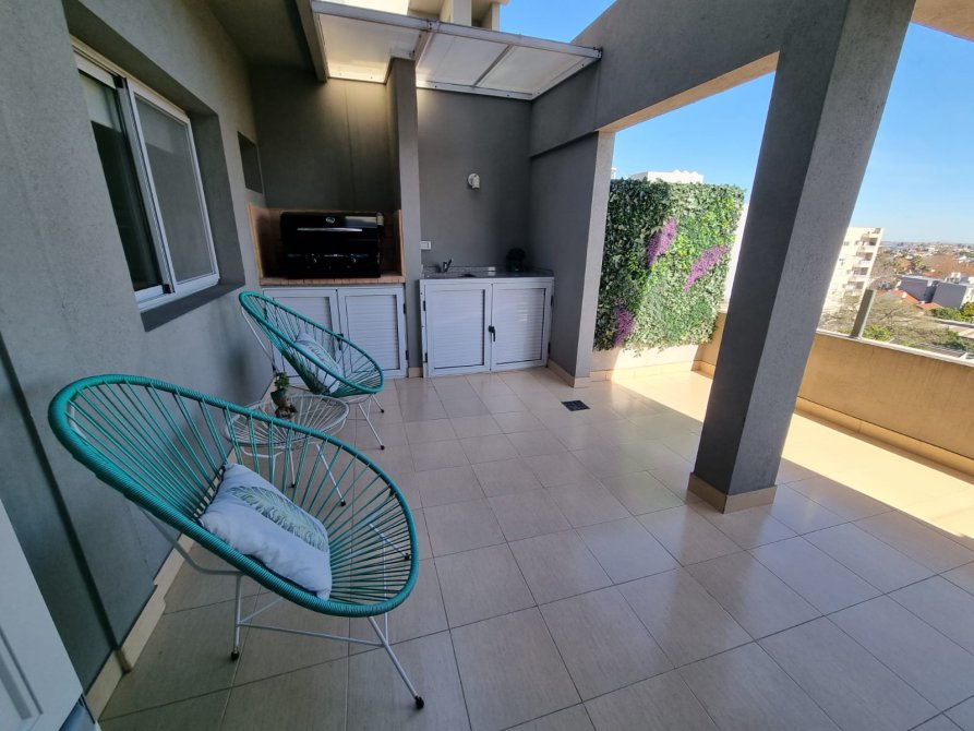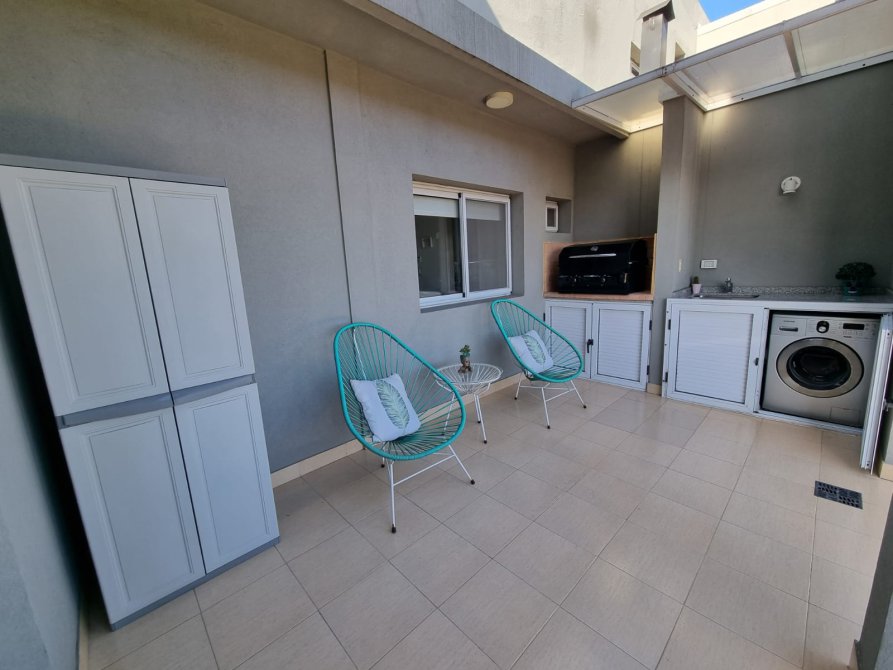 Amplia Terraza Con parrilla y espacio de guarado. mesada de granito y bacha, canilla monocomando, bajomesada y conexión para lavarropas.